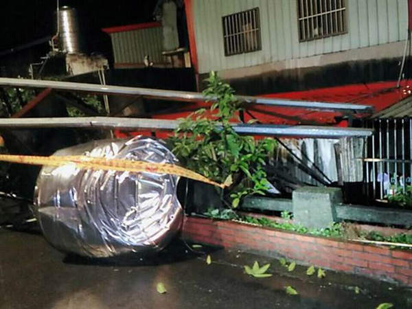 臺灣東部海域4日晚間發(fā)生多起有感地震,新北市鶯歌區(qū)國際二路路邊搭建的2噸水塔,疑因地震橫倒在小巷內。(圖片來源:臺灣《中時電子報》)