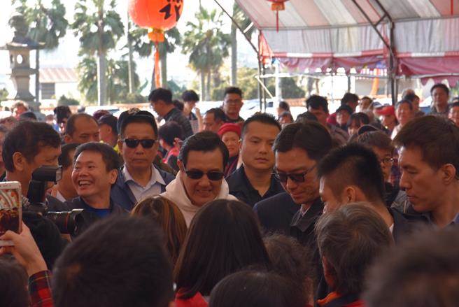 臺(tái)灣地區(qū)前領(lǐng)導(dǎo)人馬英九(白衣者)17日至新竹縣義民廟上香、贈(zèng)春聯(lián),人氣不減。(圖片來源:臺(tái)灣“中時(shí)電子報(bào)”)