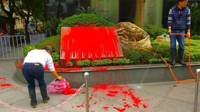 “統(tǒng)派”團(tuán)體“中華統(tǒng)一促進(jìn)黨”霸先黨部主委陳清峰,不滿日本以水砲驅(qū)逐臺灣海釣船,到“日本臺灣交流協(xié)會”朝石碑潑灑紅漆抗議。(圖片取自臺媒)