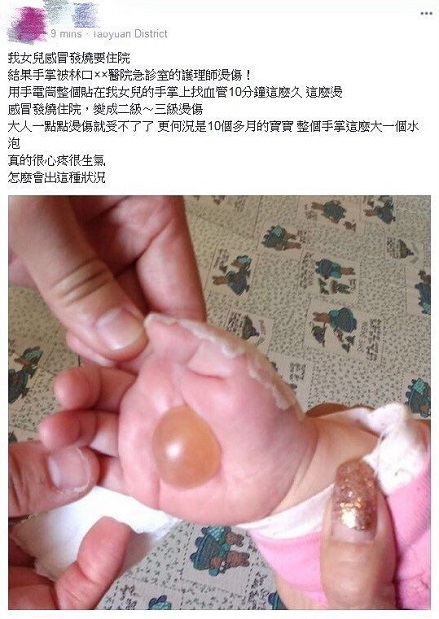 網(wǎng)友指稱,十月大女兒因感冒發(fā)燒前往林口某醫(yī)院住院治療,護(hù)理師為了找尋女?huà)胧稚涎,使用手電筒貼在女?huà)胧稚祥L(zhǎng)達(dá)十分鐘,導(dǎo)致女童二到三級(jí)燒燙傷,手掌上更起了一個(gè)巨大的水泡,網(wǎng)友憤怒發(fā)文“怎么會(huì)出現(xiàn)這種狀況?”