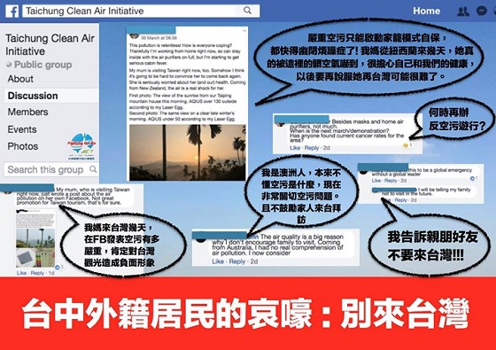 環(huán)保團體“臺灣健康空氣行動聯(lián)盟”臉書po文指出,中部空氣質(zhì)量惡劣,連住臺中的外籍人士也在FB社團熱烈討論,有位新西蘭媽媽6年前曾來過臺灣,這幾天來臺中,真的被嚴重的空污嚇壞了。大家只能待在家里,關(guān)緊門窗,空氣凈化器強力運作。