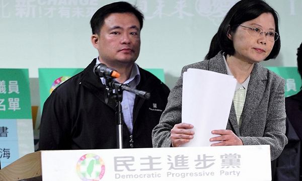 民進(jìn)黨秘書長洪耀福與黨主席蔡英文。(臺媒圖)