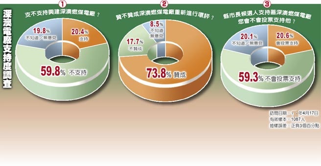 據(jù)旺旺中時民調(diào)顯示,65.3%的北北基民眾知道新北市瑞芳地區(qū)即將興建深澳電廠,73.8%贊成“重做環(huán)評”,只有17.7%反對。經(jīng)過交叉比對,不分藍(lán)綠政黨傾向,贊成深澳電廠重做環(huán)評比率都超過7成,其中,80.9%泛綠選民支持重新環(huán)評,比泛藍(lán)選民的75.1%,還高出近6個百分點。至于環(huán)保團體要求改成“污染較少的天然氣發(fā)電”,60.8%民眾接受,26%不接受,13%左右沒意見。