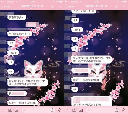 童仲彥留言表示,“這絕對不是網(wǎng)軍!這是阿童的好朋友滲透進line群組截到的圖,領(lǐng)500?是走路工嗎?”截圖內(nèi)容則可以看見,LINE群組共有12名成員,對話內(nèi)容說:“這天會很多團,要找我們自己的團,不然會領(lǐng)不到費用!薄包c完名,結(jié)束后就現(xiàn)領(lǐng)500。”等對話。