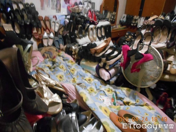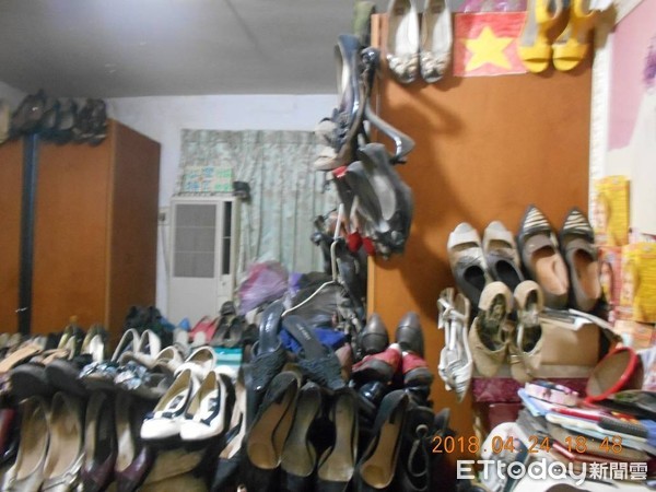 陳姓男子小小的房間堆滿盜竊來(lái)的且為受害人穿過(guò)的女鞋。(圖片來(lái)源:臺(tái)灣“東森新聞云”)