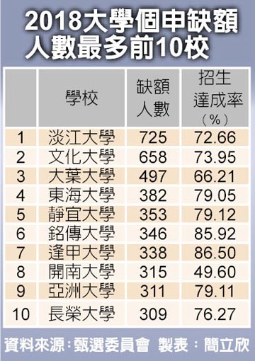 2018臺(tái)灣高校個(gè)申缺額人數(shù)最多前10校。(圖片來(lái)源:臺(tái)灣《中時(shí)電子報(bào)》)