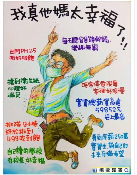 臺灣漫畫家阿德在臉書“阿德漫畫”粉絲頁發(fā)表最新諷刺漫畫,并列舉8項他認為近期內(nèi)最幸福的事件,包含“每天聽官員‘蔣干話’樂趣無窮”、“時常停電限電家里好浪漫”、“實質(zhì)總薪資高達59852元(新臺幣,下同)史上最高”、“看到年薪250萬元實習(xí)生對自己的未來充滿希望”、“出門PM2.5 吸好飽”、“搶到衛(wèi)生紙心里好滿足”、“排隊9小時終于排到499吃到飽”、“自己讀的學(xué)校有校長好幸!薄
