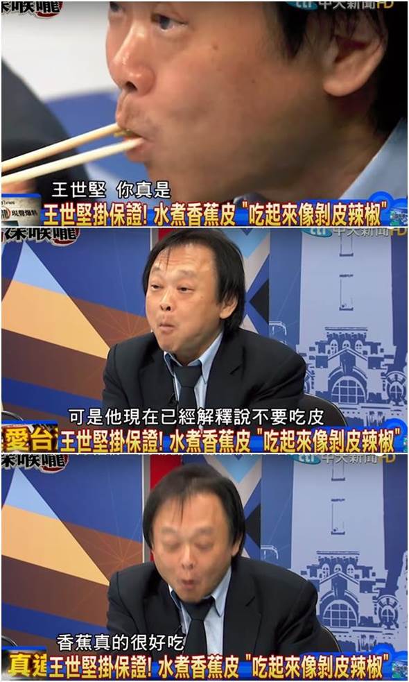賴清德日前推薦民眾生香蕉帶皮水煮,之后搭配醬油、大蒜蘸吃,還稱這種吃法“養(yǎng)生又美味”。但王世堅(jiān)卻誤解是連皮一起吃下肚,并公開在某政論節(jié)目中吃了起來,一邊吃一邊大贊香蕉皮像“剝皮辣椒”、“還蠻好吃的”。