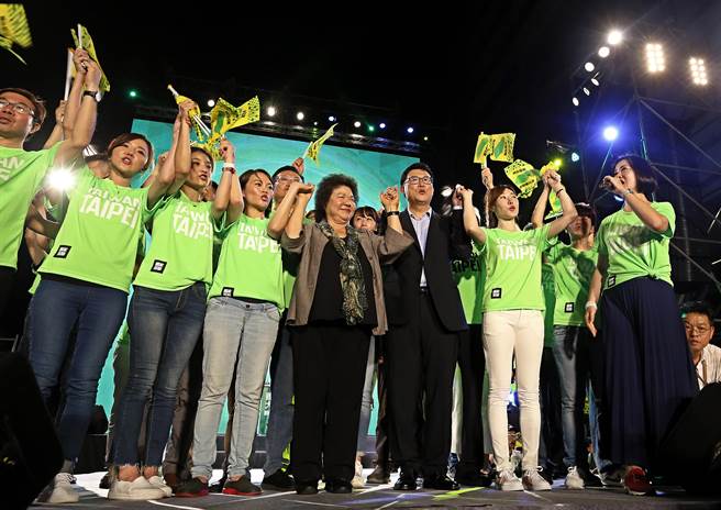 民進(jìn)黨臺(tái)北市長(zhǎng)參選人姚文智(右4)23日晚間舉辦首場(chǎng)造勢(shì)晚會(huì),凝聚綠營(yíng)士氣。(圖片來源:臺(tái)灣《中時(shí)電子報(bào)》)