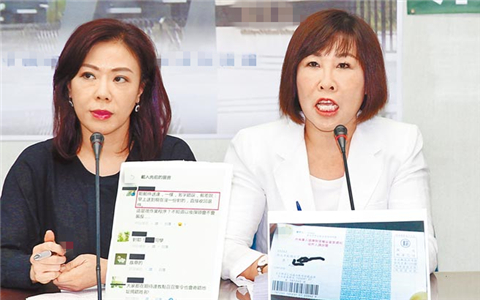 國民黨“立法院”黨團28日舉行記者會,“立委”呂玉玲(右)、李彥秀面前放著通知函照片等,痛批防務主管部門人名錯置、級數(shù)算錯等,大擺烏龍。(圖片來源:臺灣《中時電子報》)