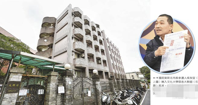 國民黨新北市長參選人侯友宜(圓圖)卷入文化大學(xué)宿舍大群館風(fēng)波。(圖片來源:臺(tái)灣《中時(shí)電子報(bào)》)