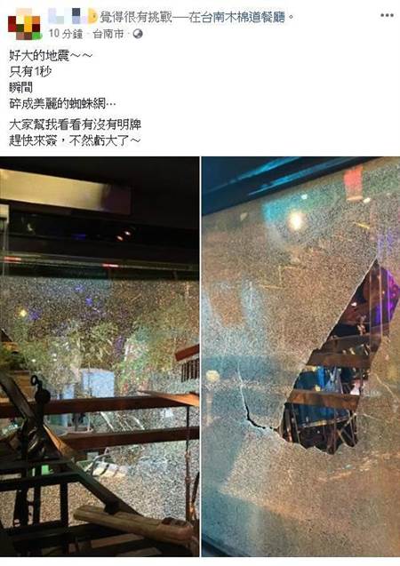 報道說,地震發(fā)生后,網(wǎng)友們在臉書《爆料公社》紛紛留言,“先上下,再來左右晃得超夸張,貓咪全炸毛!”“臺南東區(qū)碰碰兩聲……立馬從床上彈起來往樓下沖”“永康真的不夸張啦,直接蹦一聲超大力”“淺層地震,兒子說震央就在他腳下……”甚至在臺南木棉道的餐廳,地震那一秒,就讓玻璃瞬間碎成蜘蛛網(wǎng)。據(jù)臉書上永康人的說明,這次地震是比起以前的更恐怖,是瞬間地上下快速震!“剛剛真的好恐怖!第一下震完過不到一秒又震,覺得公寓被挖起來抖一下”。
