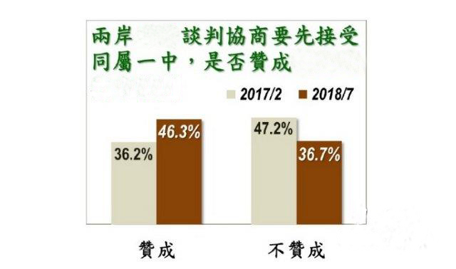 島內(nèi)帶有親綠色彩的“美麗島電子報”今天(1日)公布最新民調(diào)顯示,在兩岸關(guān)系上,針對是否愿意在接受“兩岸同屬一中”下,和大陸進(jìn)行談判協(xié)商,結(jié)果有46.3%島內(nèi)民眾贊成在此情形下,蔡英文與大陸談判,不贊成者為36.7%。值得注意的是,在2017年2月份時,“美麗島”也曾對此問題調(diào)查過一次。當(dāng)時,贊成的比例為36.2%,不贊成為47.2%。換言之,在過去的一年半時間里,民眾對接受兩岸同屬一個中國的態(tài)度,顯然已出現(xiàn)顯著翻轉(zhuǎn)。