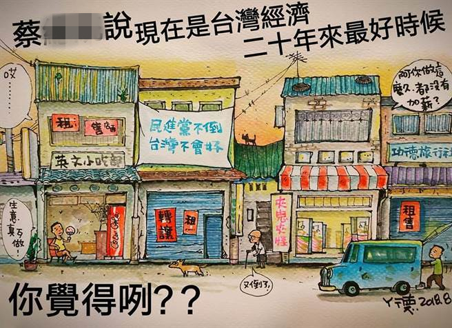 雖然蔡英文在許多場合中強調(diào)臺灣經(jīng)濟(jì)好,但各行各業(yè)仍叫苦連天。對此,“阿德漫畫”則在臉譜網(wǎng)畫出一張漫畫,圖中的房子有許多都貼著租、售、轉(zhuǎn)讓等字樣,還有人喊著“生意真歹做”“啊你做這么久,都沒有加薪?”此外,近日的夾娃娃機風(fēng)潮也在圖中;“民進(jìn)黨不倒,臺灣不會好”的海報高高掛起!鞍⒌侣嫛敝S刺表示,臺灣經(jīng)濟(jì)20年來最好狀態(tài)?有沒有到街上看過?