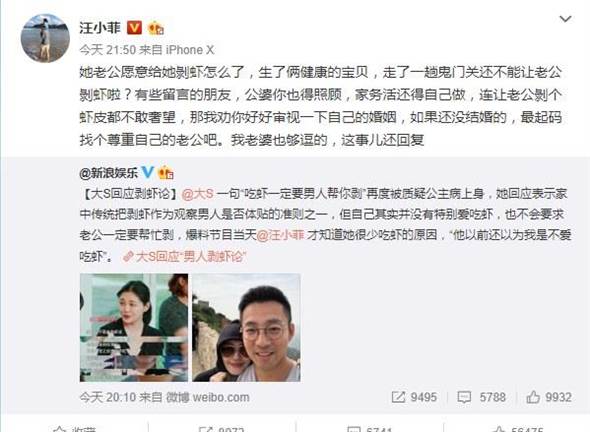 大S被質(zhì)疑,向來寵妻入骨的汪小菲自然萬般不舍,早前更在微博寫下百字文力挺愛妻:“她老公愿意給她剝蝦怎么了,生了倆健康的寶貝,走了一趟鬼門關(guān)還不能讓老公剝蝦啦?有些留言的朋友,公婆你也得照顧,家務(wù)活還得自己做,連讓老公剝個(gè)蝦皮都不敢奢望,那我勸你好好審視一下自己的婚姻,如果還沒結(jié)婚的,最起碼找個(gè)尊重自己的老公吧。我老婆也夠逗的,這事兒還回復(fù)。”