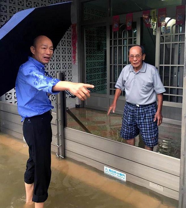 韓國(guó)瑜(左)卷起褲管,赤腳走進(jìn)淹水的高雄旗山區(qū)。(圖片來自臺(tái)媒)