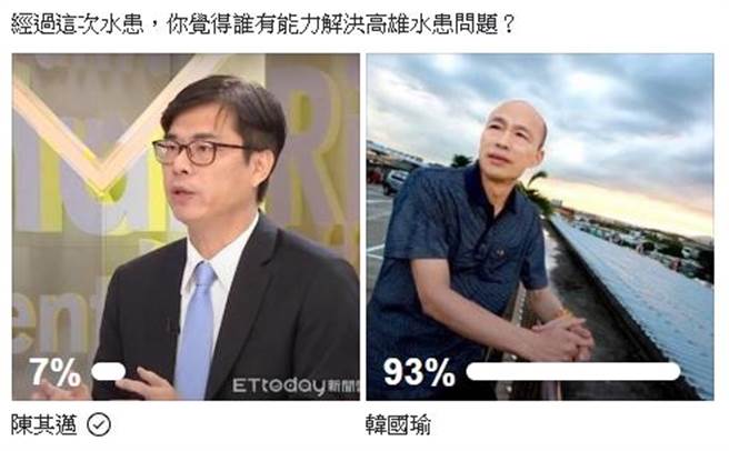 面對(duì)兩位候選人所提出的治水政策,F(xiàn)acebook社團(tuán)“歷史的鏡像”發(fā)起了一項(xiàng)投票,主題為“經(jīng)過這次水患,你覺得誰(shuí)有能力解決高雄水患問題?”沒想到韓國(guó)瑜竟拿下高達(dá)93%的超高支持率。此次水患似乎也淹掉了高雄人對(duì)民進(jìn)黨的支持。(中國(guó)臺(tái)灣網(wǎng) 李寧)