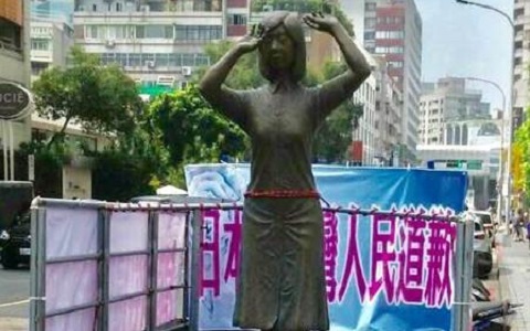國民黨臺(tái)南市黨部主委謝龍介繼前天到“日本在臺(tái)交流協(xié)會(huì)”抗議,今天則把慰安婦銅像搬到協(xié)會(huì)前面。(圖片來自臺(tái)媒)