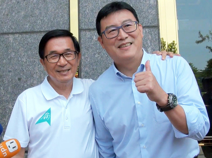 陳水扁(左)同意擔(dān)任民進(jìn)黨臺(tái)北市長(zhǎng)參選人姚文智(右)競(jìng)選最高顧問(wèn)。(圖片來(lái)源:臺(tái)灣《聯(lián)合報(bào)》)