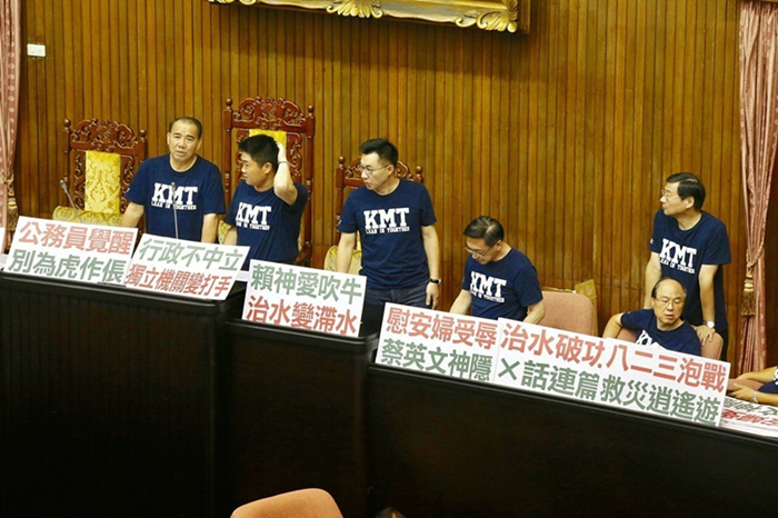 國民黨“立委”在現(xiàn)場擺滿抗議標(biāo)語,包含“公務(wù)員覺醒、別為虎作倀”“慰安婦受辱、蔡英文神隱”“賴神愛吹牛、治水變滯水”“行政不中立、獨立機關(guān)變打手”“賴清德綁樁、政策買票7400億”“假新聞?wù)妾毑、箝制新聞自由”;還在地面鋪上“東廠亂政、民主之恥”“促轉(zhuǎn)惡轉(zhuǎn)、賴揆道歉”大字。隨后一行人邊開會邊占領(lǐng)主席臺。