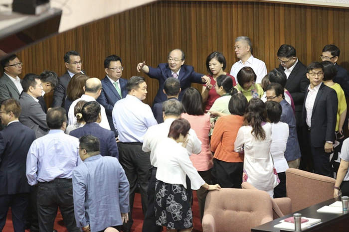 據(jù)報道,國民黨團書記長曾銘宗一早6時就先到場坐在主臺上準(zhǔn)備,其余“藍委”接近8時陸續(xù)進場在主席臺上開會,展開占領(lǐng)行動。
