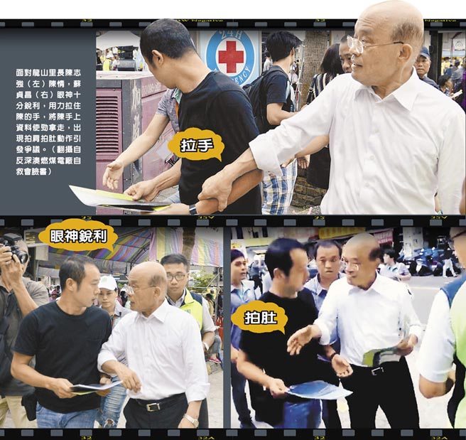 據(jù)報(bào)道,蘇貞昌23日上午在瑞芳成立競(jìng)選總部,卻在陳志強(qiáng)上前遞交“深澳電廠健康風(fēng)險(xiǎn)評(píng)估報(bào)告”時(shí),出現(xiàn)拍肩、拍肚等動(dòng)作,還向陳表示“謝謝你!祝福你喔!我們一起加油”,但隨即匆匆離去。蘇此舉引發(fā)爭(zhēng)議,雖然當(dāng)晚蘇辦發(fā)出新聞稿表示,“在拿資料的過程中,如果因?yàn)榧贝僦新曇舸,或碰觸到他讓他覺得不舒服,誠(chéng)心向他致歉”,但卻未獲陳志強(qiáng)的原諒,引發(fā)外界抨擊。