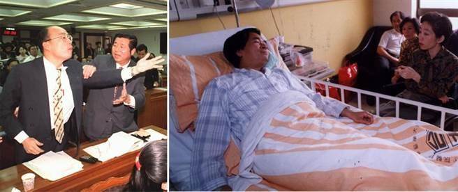 當(dāng)年民進(jìn)黨“立委”陳水扁(圖右)被時(shí)任“立委”的韓國(guó)瑜(圖左一)打了一拳, 住進(jìn)臺(tái)大醫(yī)院急診,扁妻吳淑珍在床側(cè)探視。韓國(guó)瑜回憶說(shuō),沖突導(dǎo)火線是因?yàn)楸庹f(shuō)了有辱“榮民”的一句話。
