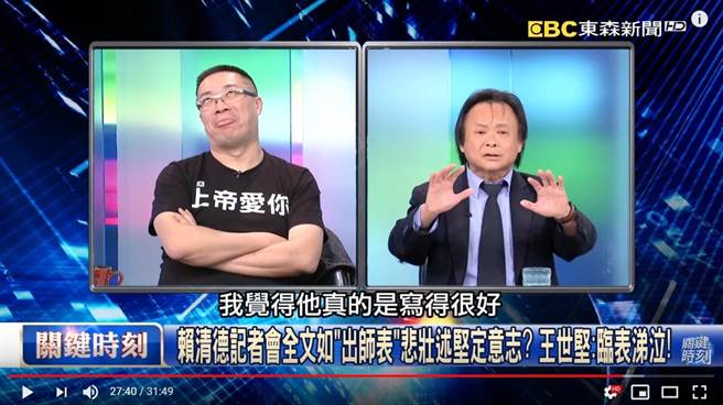 王世堅(jiān)在節(jié)目中表示,賴清德的記者會(huì)讓他相當(dāng)感動(dòng),有如《出師表》般優(yōu)秀,“出師表”三字一出,全場(chǎng)笑聲不斷,主持人更問“你有臨表涕泣嗎?”王世堅(jiān)秒回“對(duì),我臨表涕泣,我覺得他真的是寫得很好”,此時(shí)嘉賓朱學(xué)恒在一旁翻白眼吐舌忍笑,但最終還是忍不住笑了出來。
