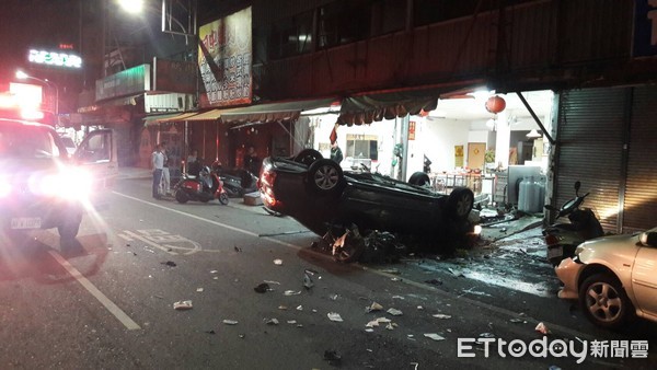 嘉義市發(fā)生重大車禍,現(xiàn)場汽車、摩托車零件散落一地,慘不忍睹。(圖片來源:臺灣“東森新聞云”)