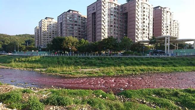 南崁溪被民眾拍下染成紅褐色的畫面。(圖片來源:臺灣“中時電子報”)