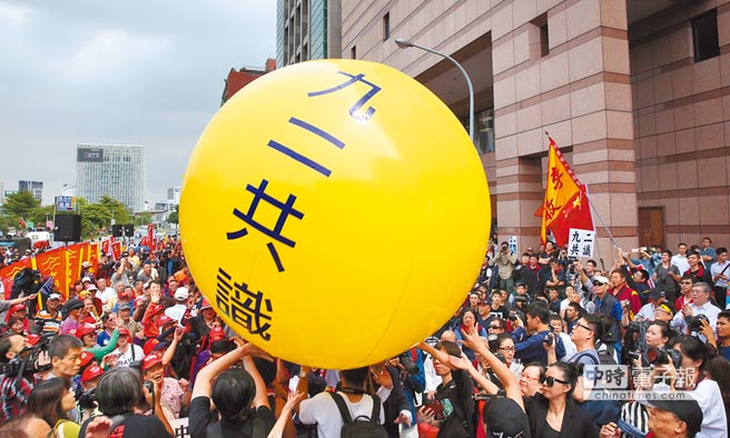 民調(diào)顯示,臺灣民眾已認(rèn)清“維持現(xiàn)狀”只是空話,轉(zhuǎn)而支持能解決問題的“九二共識”。圖為2016年蔡英文就職前,民眾要求“堅守‘九二共識’,維護(hù)兩岸和平!”(圖片來源:臺灣“中時電子報”)