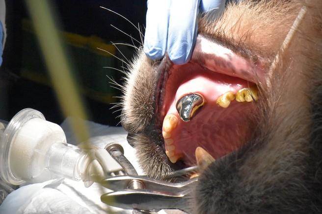 據(jù)報道,保育員發(fā)現(xiàn)“團團”左上犬齒斷裂后,隨即聯(lián)系動物園獸醫(yī)師及“野生動物健康照護與醫(yī)療小組”,經(jīng)醫(yī)療團隊判斷,“團團”左上犬齒牙髓腔已露出,有感染之風(fēng)險,必須在牙髓組織受損前保護并活化神經(jīng)。為了讓“團團”可以保全牙齒、維持進食竹桿破竹功能,并避免該犬齒再次斷裂,因此12日先進行活髓治療,將局部發(fā)炎感染之牙髓組織移除,并裝填三氧礦化聚合物(MTA)保護并活化神經(jīng)。當(dāng)天并制作齒模,運用鈦金屬材質(zhì)制作牙套。23日醫(yī)療團隊再度合作,為“團團”裝上鈦金屬牙套。