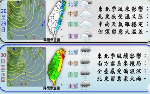 臺(tái)灣氣象部門(mén)官方臉書(shū)表示,26日起下半天將會(huì)開(kāi)始受到東北季風(fēng)影響,為時(shí)整整一周,冷空氣更可能達(dá)到冷氣團(tuán)等級(jí),中部以北低溫最低將下探到13度,南部與花東地區(qū)也不到20度。30日起除了原本的東北季風(fēng),南方云系也會(huì)前來(lái)攪局,全臺(tái)都處于濕冷狀態(tài),北部東部地區(qū)會(huì)持續(xù)降雨,甚至出現(xiàn)局部性大雨,中南部也有短暫陣雨,整個(gè)跨年連假將與雨水度過(guò)。