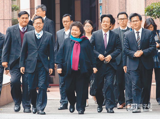 2015年陳菊率賴清德、鄭文燦、林佳龍等“直轄市長(zhǎng)”步出“行政院”,意氣風(fēng)發(fā)。(圖片來(lái)源:臺(tái)灣“中時(shí)電子報(bào)”)