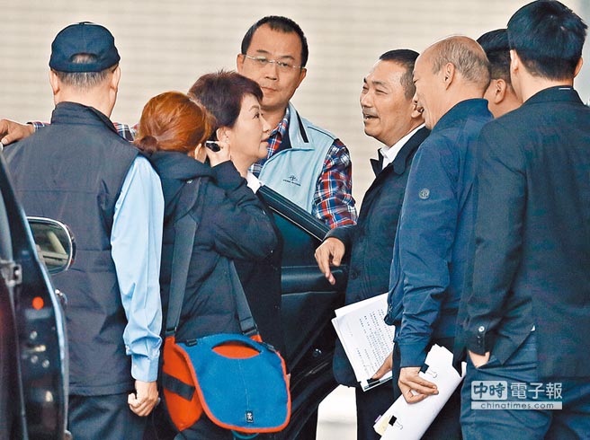 “六都”新任市長(zhǎng)27日首次出席“行政院院會(huì)”,會(huì)后盧秀燕、侯友宜與韓國(guó)瑜在“行政院”門(mén)口交換意見(jiàn)。(圖片來(lái)源:臺(tái)灣“中時(shí)電子報(bào)”)