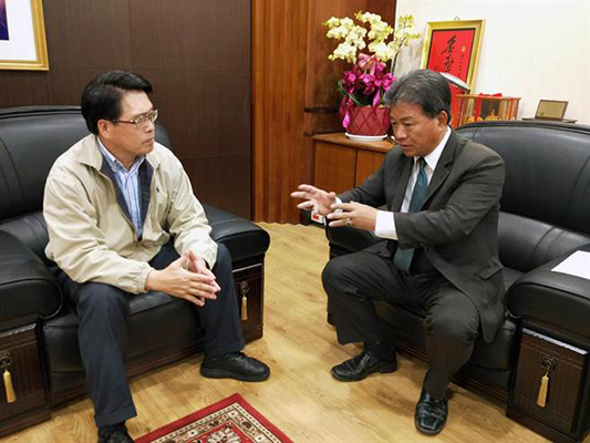 參與民進黨主席補選的“臺灣民意基金會”董事長游盈隆拜會臺南市議長郭信良。(圖片來源:臺灣“中時電子報”)