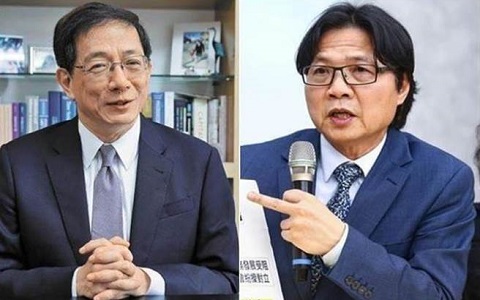 臺當局前“教育部長”葉俊榮(右)宣布“勉予同意”管中閔(左)接任臺大校長后閃辭。(圖片來自臺媒)