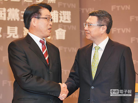 民進黨第16屆黨主席補選電視政見發(fā)表會4日舉行,前臺當局“行政院秘書長”卓榮泰(右)與“臺灣民意基金會”董事長游盈。ㄗ螅⿻跋嗷ノ帐种乱。(圖片來源:臺灣“中時電子報”)