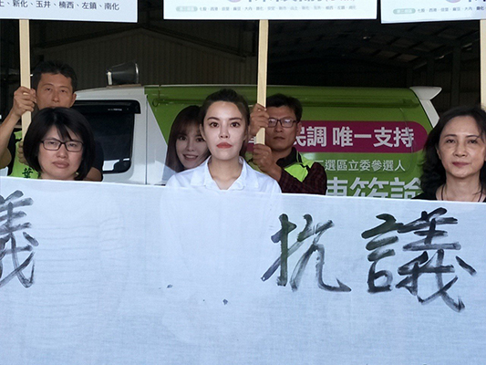 民進(jìn)黨臺南市“立委”初選裂痕加大,參選人陳筱諭(中)陣營拉白色布條質(zhì)疑過程不公。(圖片來源:臺灣《聯(lián)合報》)