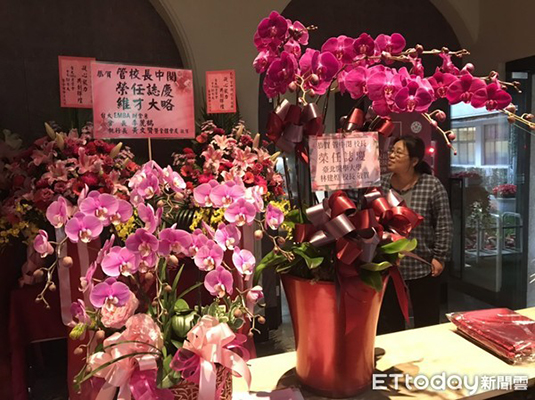 會(huì)場擺滿祝賀花籃。(圖片來源:臺(tái)灣“東森新聞云”)