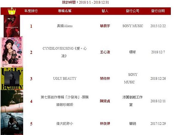 除了第一名由華晨宇?yuàn)Z下外,前五名分別為王心凌《CYNDILOVES2SING愛。心凌》、蔡依林《UGLY BEAUTY》、陳綺貞《沙發(fā)!芬约傲挚〗艿摹秱ゴ蟮拿煨 。(中國臺(tái)灣網(wǎng) 楊旋)