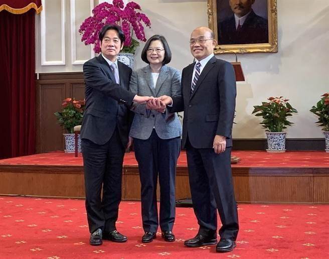 在蔡英文(中)見(jiàn)證下,蘇貞昌(右)正式與賴(lài)清德(左)交接。(圖片來(lái)源:臺(tái)灣“中時(shí)電子報(bào)”)