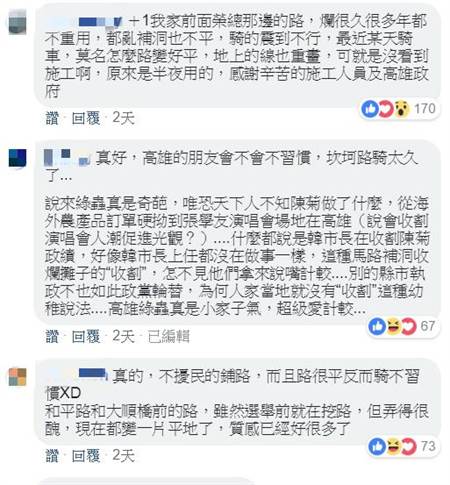 中國臺灣網(wǎng)1月17日訊 據(jù)臺灣“中時電子報”報道,新任高雄市長韓國瑜25號正式就職后,隨即馬不停蹄跑行程,幫忙招商推銷高雄,同時也開始全面整修高雄坑坑洞洞的馬路,就有網(wǎng)友驚呆,早上騎車出門感覺很不協(xié)調,才發(fā)現(xiàn)馬路已經鋪平了,直呼好不習慣。