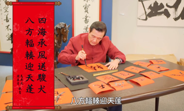 中國臺灣網(wǎng)1月20日訊 據(jù)臺灣“東森新聞云”報道,農(nóng)歷春節(jié)將至,島內(nèi)政治人物紛紛發(fā)出春聯(lián)賀新年。寫得一手好字的前臺灣地區(qū)領(lǐng)導(dǎo)人馬英九,每年春聯(lián)一向受到民眾歡迎,這次的“四海承風(fēng)送駿犬、八方輻輳迎天蓬”春聯(lián)才剛開放索取,10萬份僅一個下午就被搶光。