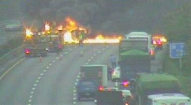 消防隊趕到現(xiàn)場時整臺小火貨車已經(jīng)陷入火海,火勢從內(nèi)側(cè)及中線車道延燒至外側(cè)車道,由于正值上班交通高峰時間,該路段嚴(yán)重受阻約半個多小時,目前僅開放車輛路肩通行。