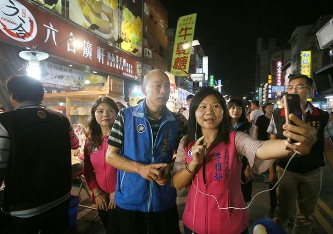 高雄市長韓國瑜(中)曾率李雅靜(前排右)、陳玫娟(左二)等10位國民黨市議員前往六合夜市拜訪攤商,探詢生意情況,李雅靜還以手機(jī)現(xiàn)場直播。(圖片來源:臺(tái)灣“中時(shí)電子報(bào)”)