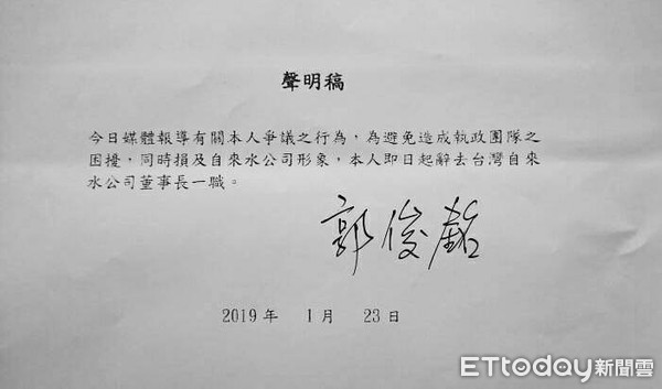 今日媒體報導(dǎo)有關(guān)本人爭議之行為,為了避免執(zhí)政團(tuán)隊困擾,同時損及自來水公司形象,本人即日起辭去臺灣自來水公司董事長一職。