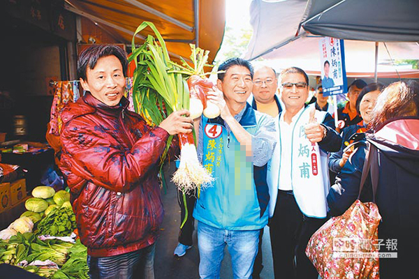 國(guó)民黨“立委”候選人陳炳甫(左二)24日前往市場(chǎng)拜票,菜販送上大蒜和好采頭預(yù)祝高票當(dāng)選。(圖片來(lái)源:臺(tái)灣“中時(shí)電子報(bào)”)