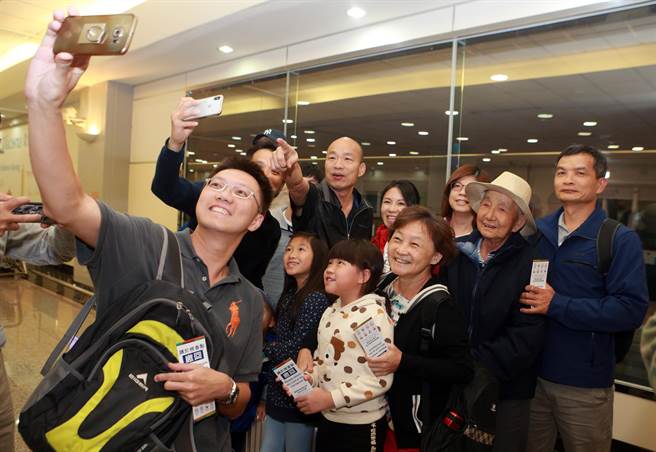 高雄市長韓國瑜7日晚間返臺,一下機就被熱情的民眾拉去合影。(圖片來源:臺灣“中時電子報”)