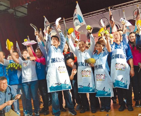 韓國瑜、侯友宜、盧秀燕為謝龍介站臺,要促銷臺灣農特產,希望幫臺灣的鄉(xiāng)親“拼經濟”。(圖片來源:臺灣“中時電子報”)